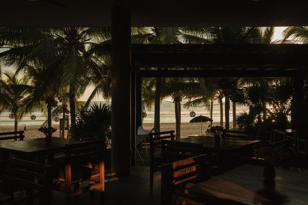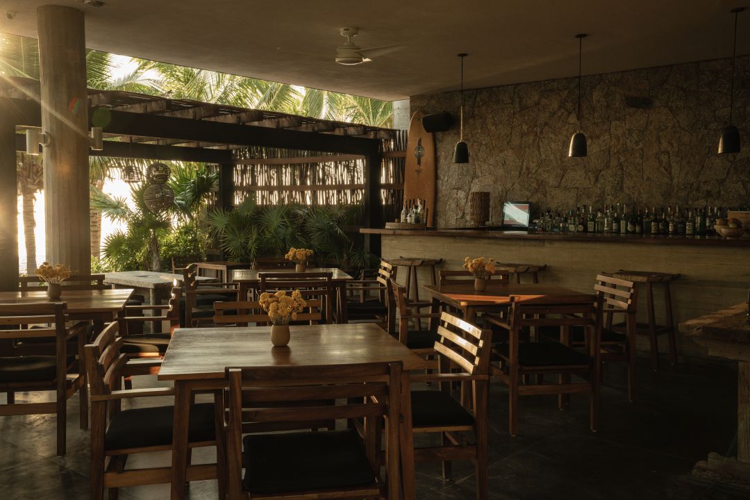 Just steps from the shore, La Terraza unfolds beneath a handcrafted wooden pergola, where the Pacific breeze and the rhythm of the waves shape each moment. Colors echo the surrounding landscape—the mint blue of the chairs against rustic concrete floors, tropical wood tables reflecting the warmth of the coast—creating a sanctuary of refined simplicity.