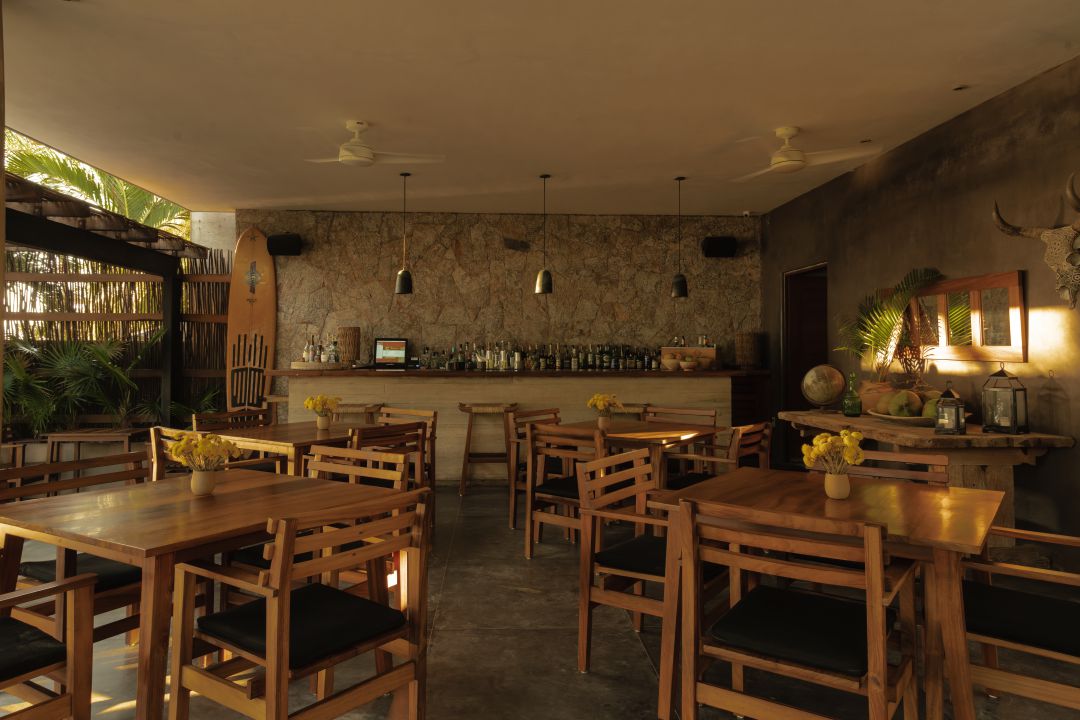 Just steps from the shore, La Terraza unfolds beneath a handcrafted wooden pergola, where the Pacific breeze and the rhythm of the waves shape each moment. Colors echo the surrounding landscape—the mint blue of the chairs against rustic concrete floors, tropical wood tables reflecting the warmth of the coast—creating a sanctuary of refined simplicity.